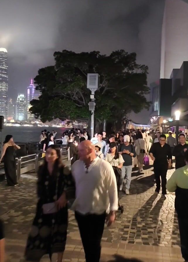 The video depicts a nighttime scene in what appears to be a busy urban waterfront area. Numerous people are walking along a paved path, suggesting a public promenade or walkway. A large tree stands near the center of the frame, and a few illuminated buildings are visible in the background, indicating a city skyline. There is a body of water to the left, potentially a harbor or river. The atmosphere looks somewhat hazy or foggy, possibly due to pollution or natural weather conditions. People are walking in both directions, some pushing strollers and many are dressed in casual attire. The overall impression is that of a crowded public space, popular during evening hours.