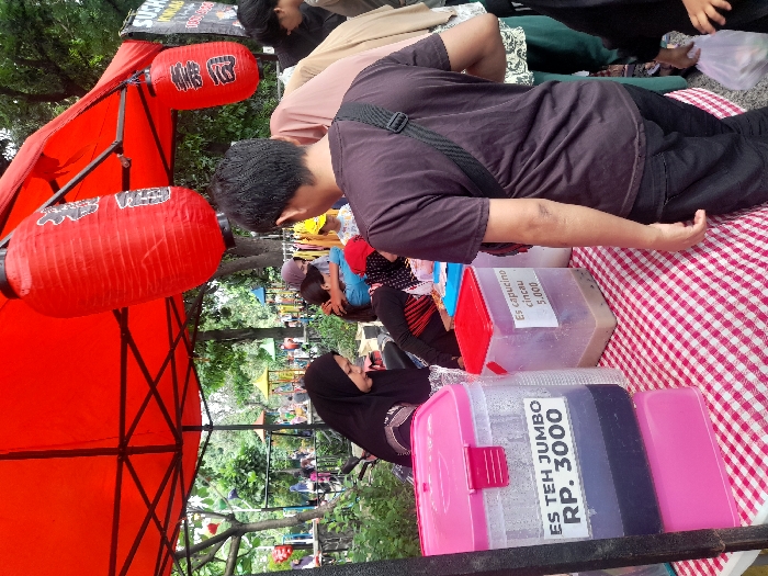 A food stall features a red tent adorned with Japanese lanterns. A customer in a dark shirt leans over the counter, where two containers of beverages are displayed: "Es Teh Jumbo" and "Es Capucino Cincau," priced at 3000 and 5000, respectively. A woman in a hijab sits behind the counter. The setting is outdoors, possibly in a park, with trees and people in the background.