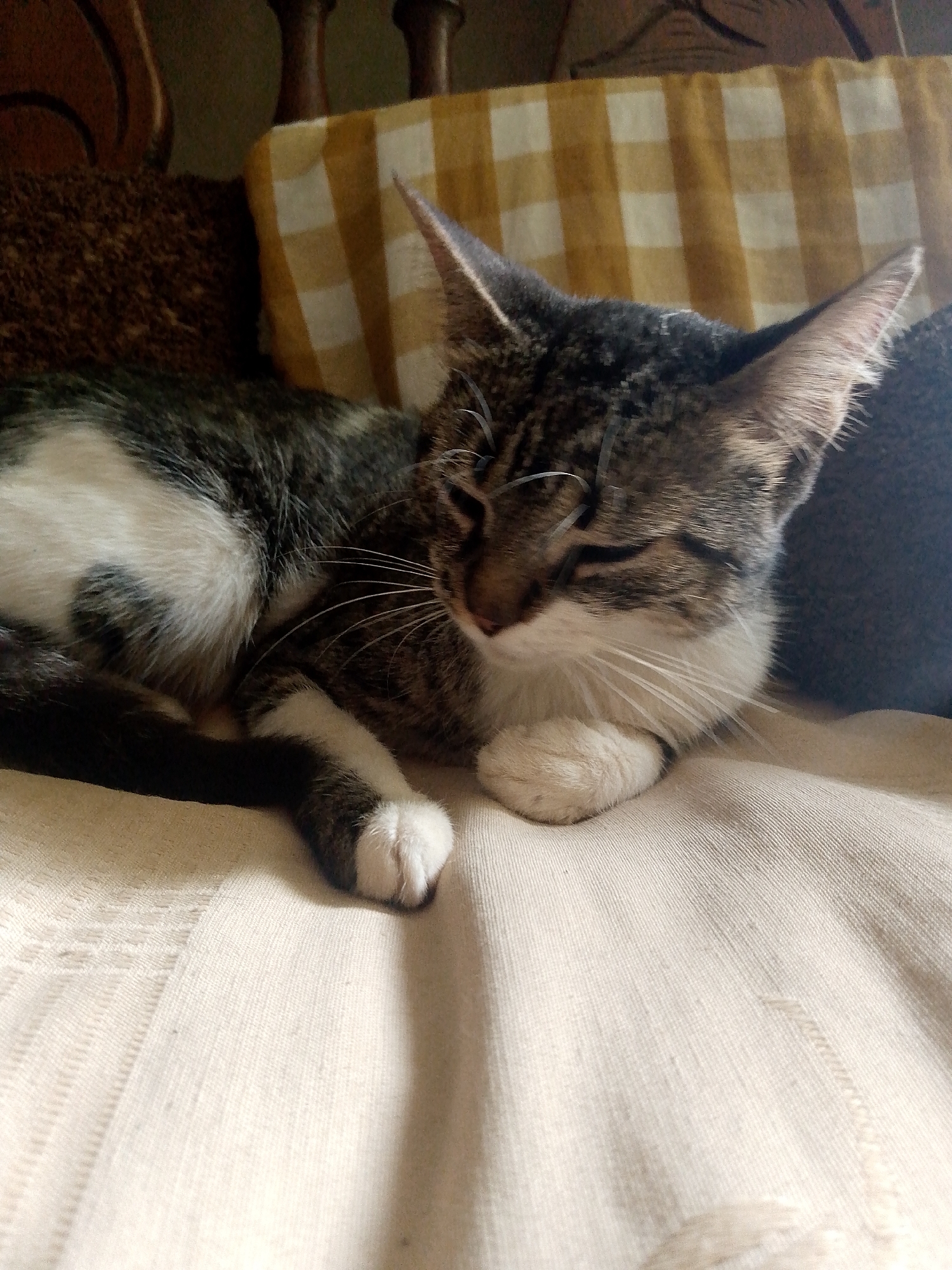 - "A tabby cat with white paws is lying on a light-colored, textured cushion" by FM-Oe2JJ3, licensed under CC BY 4.0