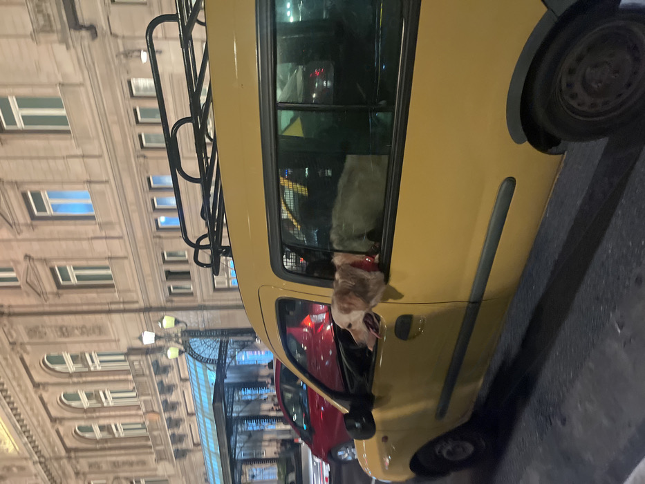 An evening street scene in Buenos Aires, Argentina, depicts a yellow Renault Kangoo van on Libertad Street, in the San Nicolás neighborhood, near the Teatro Colón. A light-colored dog, appearing to be a Golden Retriever, with reddish-brown fur on its head and ears, and wearing a red collar, has its head extended outside the open driver's side front window; its tongue is slightly visible. The van is equipped with a black roof rack. In the background, a multi-story, classical-style stone building featuring arched windows and balconies is illuminated. An ornate streetlamp with multiple globes and a prominent blue-lit glass-and-metal canopy structure, associated with the Teatro Colón entrance, are also visible. A red vehicle is partially obscured behind the yellow van. The street surface consists of dark asphalt.