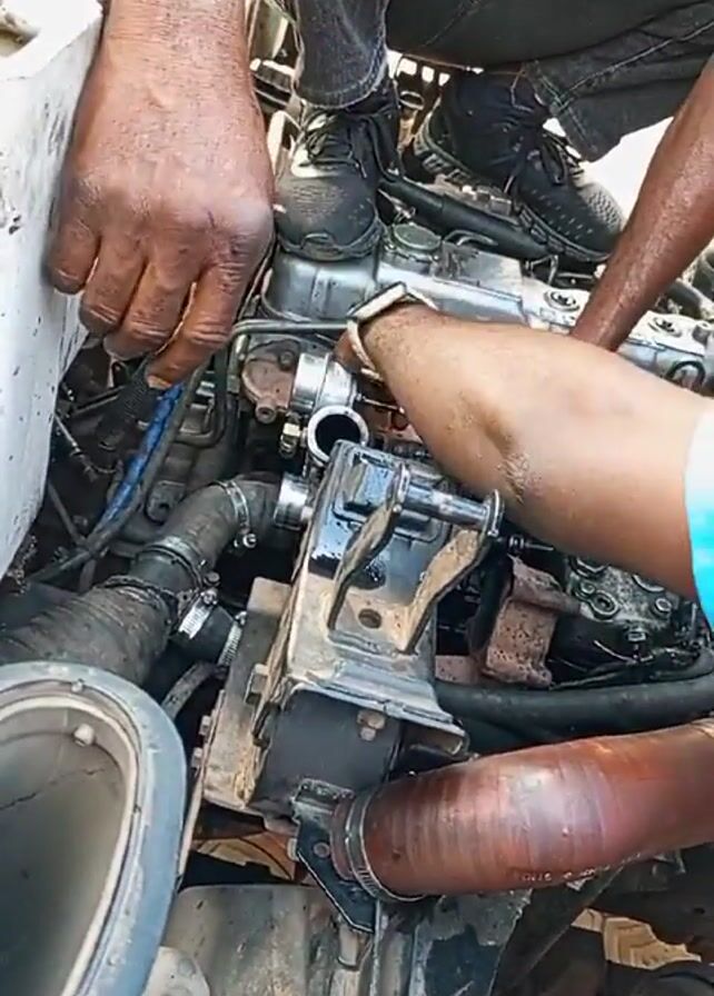 Two men are working on the engine of a truck. They are leaning over the engine bay, their hands visible as they manipulate parts and hoses. One man is wearing gray pants, the other is wearing blue. The engine is dirty and has various hoses and metal components visible. The video is taken from a close-up perspective, focusing on the engine and the hands of the men. The bottom left of the frame shows a sticker saying "Infinix HOT50i".