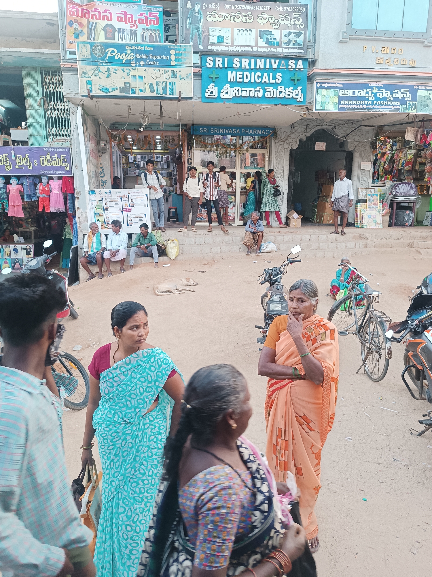 The image depicts a bustling street scene in Kothacheruvu, India, characterized by multiple storefronts and pedestrian activity under daylight. **Environment:** The scene unfolds on an unpaved, dusty street lined with two-story commercial buildings. Overhead electrical wires are visible across the top of the frame. **Buildings and Storefronts:** * **Left:** A building with "MANASAN FASHIONS" and "Pooja Mobile Repairing Centre" signs in Telugu and English, displaying children's clothing on mannequins outside. A closed accordion-style metal gate is visible. * **Center:** "SRI SRINIVASA MEDICALS" and "SRI SRINIVASA PHARMACY" occupy a building with a prominent green cross symbol and an ornate arched entrance. * **Right:** "ARADHYA FASHIONS" is indicated by a sign, with various packaged goods and household items displayed outside. **People:** Approximately 20 individuals are visible, engaged in various activities. * **Foreground:** * On the far left, a young man's back is visible, wearing a light checkered shirt. * In the center-left, a woman in a light blue saree with white patterns holds a dark bag and looks slightly right. * In the center-right, an older woman in an orange and white patterned saree stands, left hand to her chin, looking right. She wears green bangles. * On the far right, the back of an older woman with a patterned top and red bangles is partially visible. * **Midground (on street and steps):** * A light-colored dog lies on the dusty ground, center-left. * A woman in a blue saree is seated on the ground on the right, partially obscured by a bicycle. * On the steps of the leftmost shop, three men are seated: one in a white shirt and green shawl, one in a white shirt, and one in a green shirt. * On the steps of Sri Srinivasa Pharmacy, several men stand, including one near the entrance in a white shirt and patterned lower garment, and two younger men near a display on the left. * On the steps of Aradhya Fashions, an older man in a white shirt and dhoti stands, facing right. * **Background:** Several other individuals are partially visible inside or near the shop entrances. **Objects:** * **Vehicles:** A black scooter/moped is parked center-left, a black bicycle stands upright center-right, and the front of an orange and black motorcycle is visible on the far right. * **Shop Merchandise:** Children's clothes, mobile phone accessories, and various packaged goods are displayed. * **Other:** Cardboard boxes, a yellow sack, plastic bags, and some litter are scattered on the ground. **Actions and Interactions:** People are standing, walking, sitting, and conversing, indicating a typical daily street scene with commercial and social activity. The foreground individuals appear to be moving through the space, while others are gathered on the shop steps.