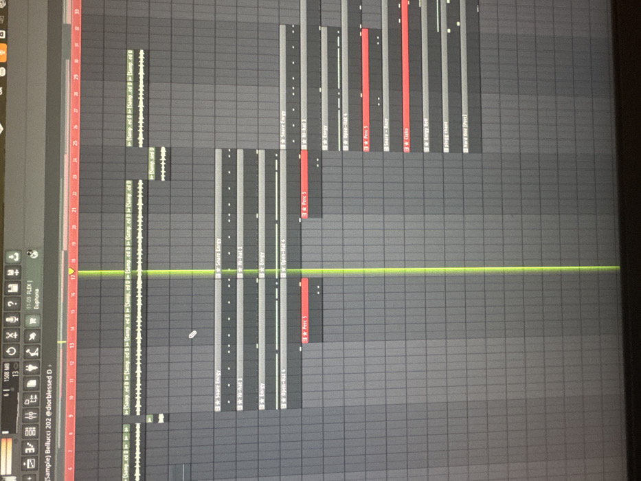 A computer monitor displays the digital audio workstation (DAW) software FL Studio. The screen shows the playlist view of a musical project, characterized by a dark gray grid background with horizontal tracks. Various audio clips are represented by waveforms and colored horizontal bars, indicating different instrumental or percussive elements such as "Snare Energy," "Hi-hat," "Energy," "Open-Hat 4," "Perc 5," "Snare - Daze," "Clako," "Energy Bell," "plugg chant," and "Hard One [Perc]." A prominent vertical neon green line traverses the screen, indicating the current playback position within the timeline. A white mouse cursor is visible near the upper-left quadrant. The top bar of the software displays information including "1508 MB" and "FLEX | Euphoria," with the project title partially visible as "(Sample) Bellucci 202 @diorblessed D." No individuals or external objects are visible. The image contains no visual information to determine a physical location in New York, United States, or any other geographical area.