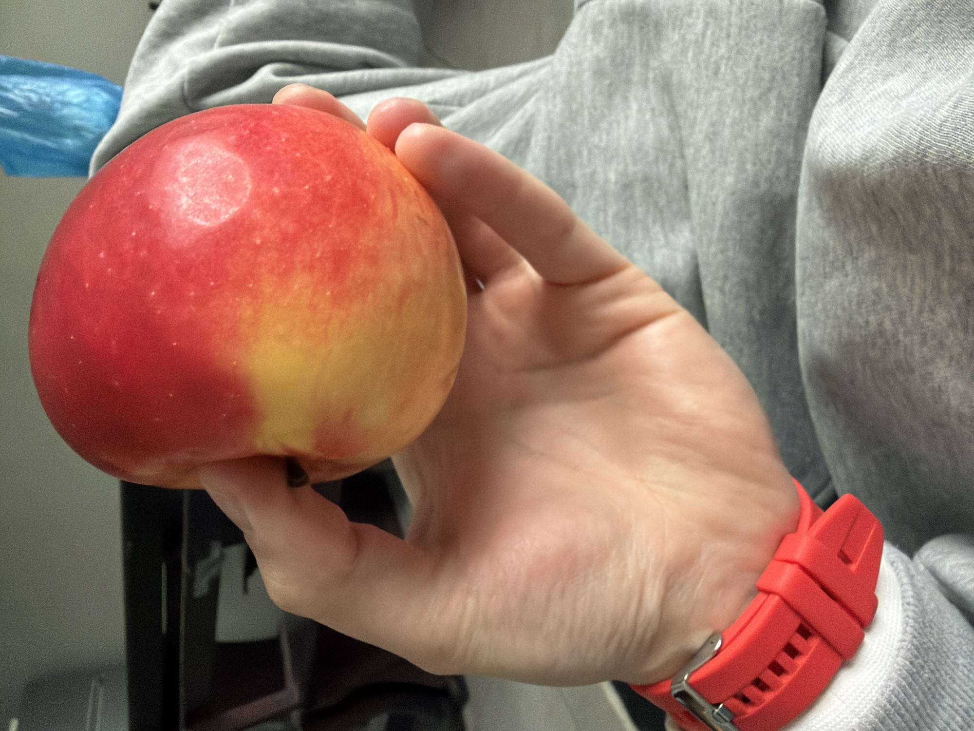 A person wearing a gray sweatshirt and a red watch is holding a red and yellow apple in their hand