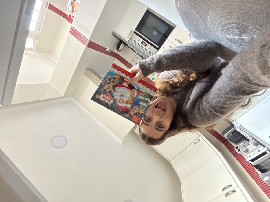 An overhead-angled photograph depicts a female subject in a residential kitchen, identified as being in Lisbon, Portugal. The subject, a woman with long, wavy brown hair, is positioned in the foreground, smiling broadly with wide eyes and an open mouth, her tongue slightly extended. She is wearing a grey knitted sweater. Her left arm, extended upwards, holds a "Kinder" branded advent calendar featuring Santa Claus, reindeer, and a Christmas tree, partially obscuring her head. The background shows a modern kitchen environment. On the left, white upper cabinets with silver handles are mounted above a light-colored countertop. A red-tiled or patterned backsplash extends along the wall above the countertop, continuing as a decorative strip on a wall or structural beam towards the right side of the frame. Visible on the countertop are small kitchen appliances, including a microwave and a toaster. Further right, a stainless steel built-in oven with a digital display is visible beneath a similar appliance. A white kettle rests on a surface behind these appliances. The walls and ceiling are white, with recessed circular light fixtures visible in the ceiling. A window is present in the upper right, admitting natural light. A wooden structural beam is also visible in the upper right portion of the kitchen space. A white, circular woven mat or cushion is partially visible in the lower right corner, suggesting a seating area or floor covering.