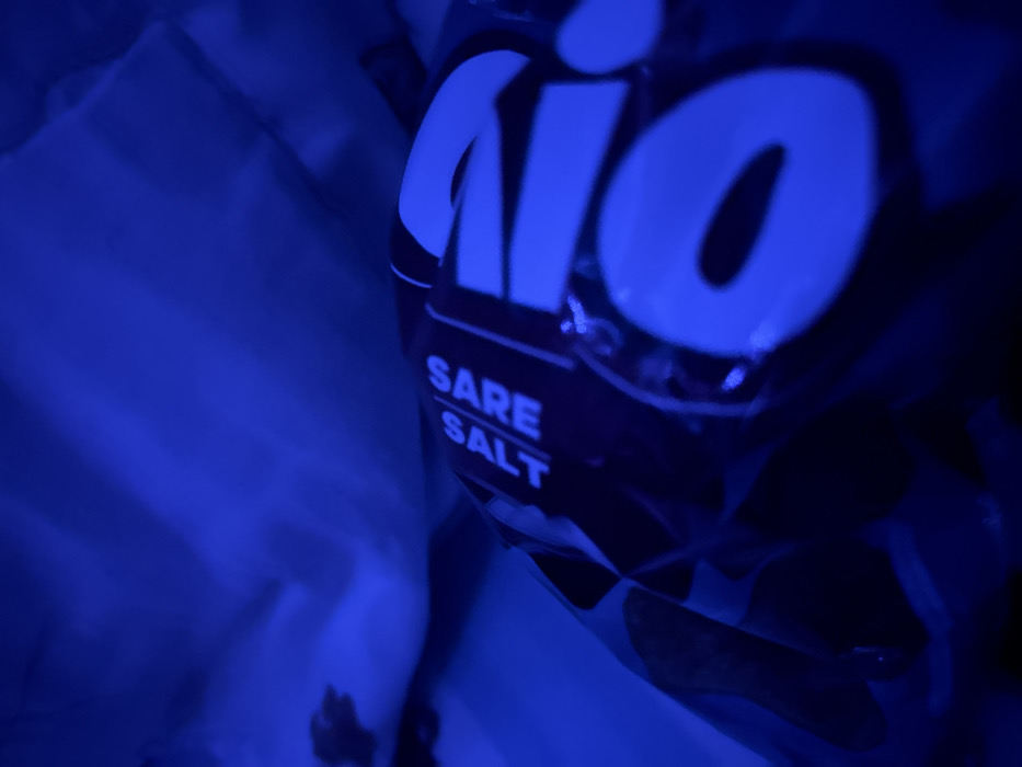 - "The scene, located in Yambol, Bulgaria, depicts a close-up, oblique view of a dark-colored package, likely a food product, illuminated by a pervasive blue light source" by FM-ayxDq1, licensed under CC BY 4.0