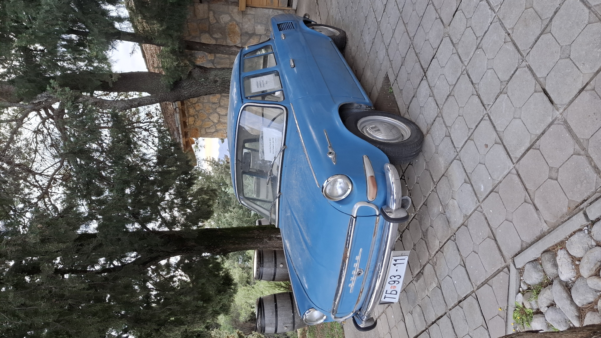 A vintage, light blue, four-door Škoda 1000 MB sedan is parked on a paved surface composed of interlocking gray octagonal and square concrete tiles. The vehicle is facing slightly to the right of the viewer. It features chrome bumpers, headlight bezels, and side trim. A white paper sign, partially readable as "НАЈЉЕПШЕ ВАС МОЛИМО ДА НЕ" (WE KINDLY ASK YOU NOT TO...), is affixed to the interior of the windshield. The front license plate, "ТБ 93-11", is affixed to the lower chrome bumper. The car is situated outdoors, under the shade of several large evergreen trees, likely cypress or similar conifers, whose dense foliage dominates the upper frame. To the left rear of the car, two dark wooden barrels with metal bands are positioned on the paved surface. A stone-faced building with a brown tiled roof is partially visible behind the car and trees to the right. In the far background, beyond the trees, a hazy landscape with hills or mountains under a light sky is discernible. The scene is located in Trebinje, Bosnia and Herzegovina.