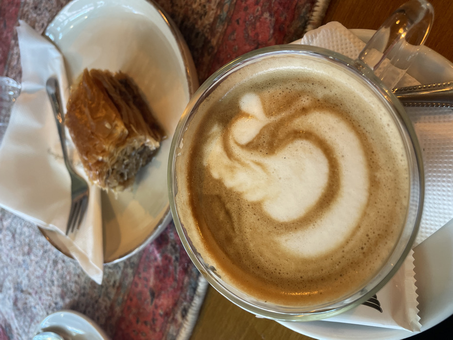 The image displays a close-up, elevated perspective of a table setting featuring coffee and dessert. In the foreground, a clear glass mug holds a latte with intricate white latte art depicting a stylized swan with a small heart shape integrated into its design. The mug rests on a white saucer, beneath which a white paper napkin is visible, along with the handle of a silver spoon. In the midground, slightly out of focus, a single piece of golden-brown, layered baklava is presented on a small, light-colored ceramic plate with a textured rim. A silver fork is positioned on a folded white paper napkin on this plate. The items are arranged on a wooden table partially covered by a traditional-style rug or tablecloth, featuring patterns in shades of red, maroon, pink, and cream. A blurred clear glass, likely containing water, is visible in the upper right background. This scene is typical of a traditional cafe or *slastičarna* (sweet shop) found within the **Baščaršija Old Town district of Sarajevo, Bosnia and Herzegovina.**