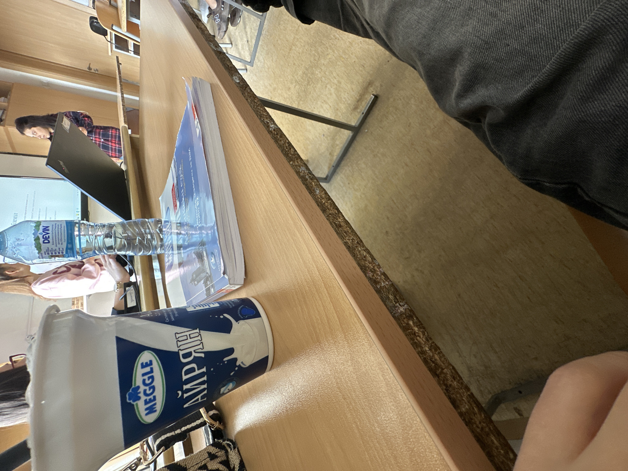 This image depicts an indoor scene within a classroom or lecture hall in Lovech, Bulgaria, viewed from a seated perspective. In the immediate foreground, the right hand and a leg (wearing dark gray trousers) of the observer are visible. On the light-brown laminate tabletop are a full white "MEGGLE АЙРЯН" cup, a nearly full transparent plastic "DEVIN" water bottle, and a stack of two books, the top one featuring Cyrillic text including "Български език" and "Hugo B2." A black and beige patterned bag is partially visible on the far left of the table. In the background, three other individuals are present. To the left, a person with dark hair and glasses is partially visible, seated. A second person with light brown hair, wearing a pink long-sleeved shirt, is also seated. To the right, a woman with dark hair, wearing a red and black plaid shirt, stands next to a large projector screen displaying Cyrillic text. She holds a closed black laptop (a ThinkPad), appearing to be engaged in a presentation or instruction. The room features light-colored walls, light wood-framed desks, and a light-colored floor. A wooden door is visible in the far-right background.