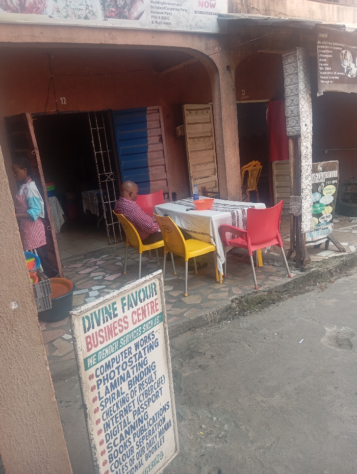 The scene depicts a commercial street in Warri South, Nigeria, featuring the facade of a two-story building with multiple ground-level units. The building is constructed of reddish-brown material, with arched doorways and metal grates or doors. Unit "22" and "23" are labeled above two separate entrances. In the foreground, a white sandwich board sign for "DIVINE FAVOUR BUSINESS CENTRE" is prominently displayed, listing services such as "COMPUTER WORKS, PHOTOSTATING, LAMINATING, SPIRAL BINDING, CHECKING OF RESULT, INTERNET (CYBER CAFÉ), DIGITAL PASSPORT, SCANNING, BOOKS PUBLICATIONS, COLOUR SEPERATION, SALES OF OUR DAILY MANNA, NATIONAL BOOKLET," and a partial contact number ending in "613029". Immediately behind the sign, an outdoor seating area is visible. A rectangular table is covered with a white tablecloth and a patterned black and white fabric overlay. A blue plastic bowl containing a clear bottle is centered on the table. Three plastic chairs, two red and one yellow, are positioned around the table. A bald male in a red, white, and blue plaid shirt is seated on a yellow plastic chair at this table, facing away from the camera. To the left, within an open doorway of unit "22", a person in a light blue and pink striped garment stands near various stacked colorful plastic containers and a gray plastic crate. To the right, another doorway reveals a yellow plastic chair further inside. An upper banner sign on the building advertises "Wedding/Anniversary Birthday/Corporate Party Personal, Party POS & BEDS & Much more." with the text "BOOK NOW 08023333346". Another smaller, darker sign to the right states "WE OFFER THE FOLLOWING..." with partially legible text below. The ground consists of patterned paving stones directly in front of the building, transitioning to a concrete curb and an asphalt road surface with scattered debris.