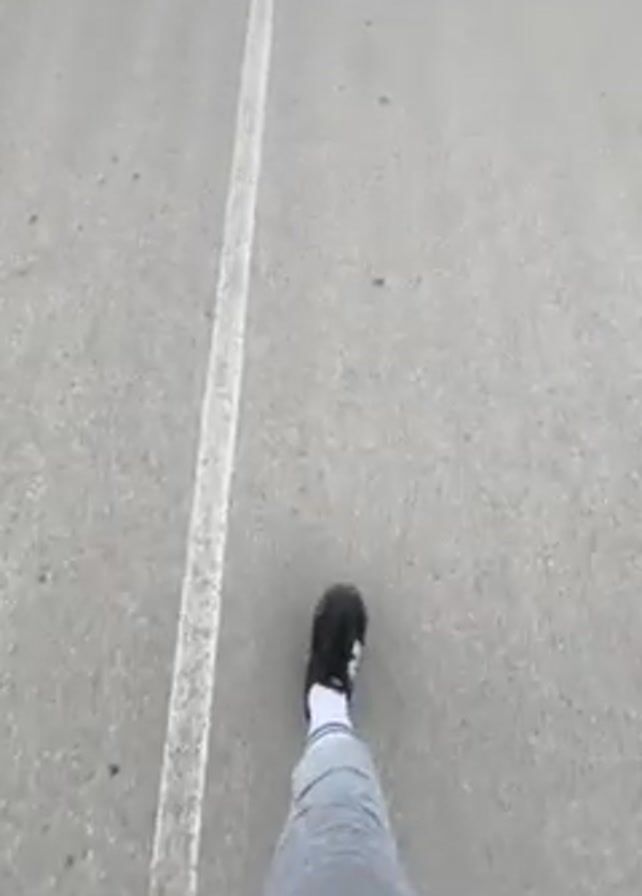 first-person view of someone walking down a gray asphalt road with a white line marking the center