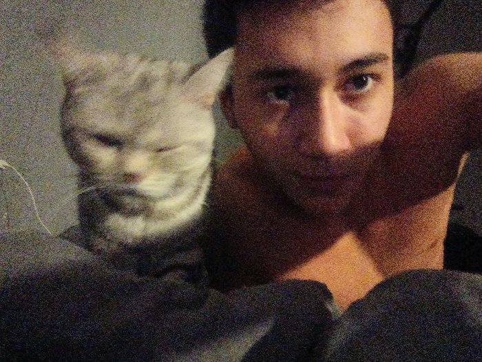 A close-up, grainy selfie features a shirtless man with dark hair and eyes. He is positioned next to a light gray tabby cat, which appears to be squinting or sleeping. The background is a textured, neutral gray. The bottom of the frame is dominated by a dark, soft material, possibly a blanket or clothing. The lighting is dim, contributing to the overall grainy quality of the image.