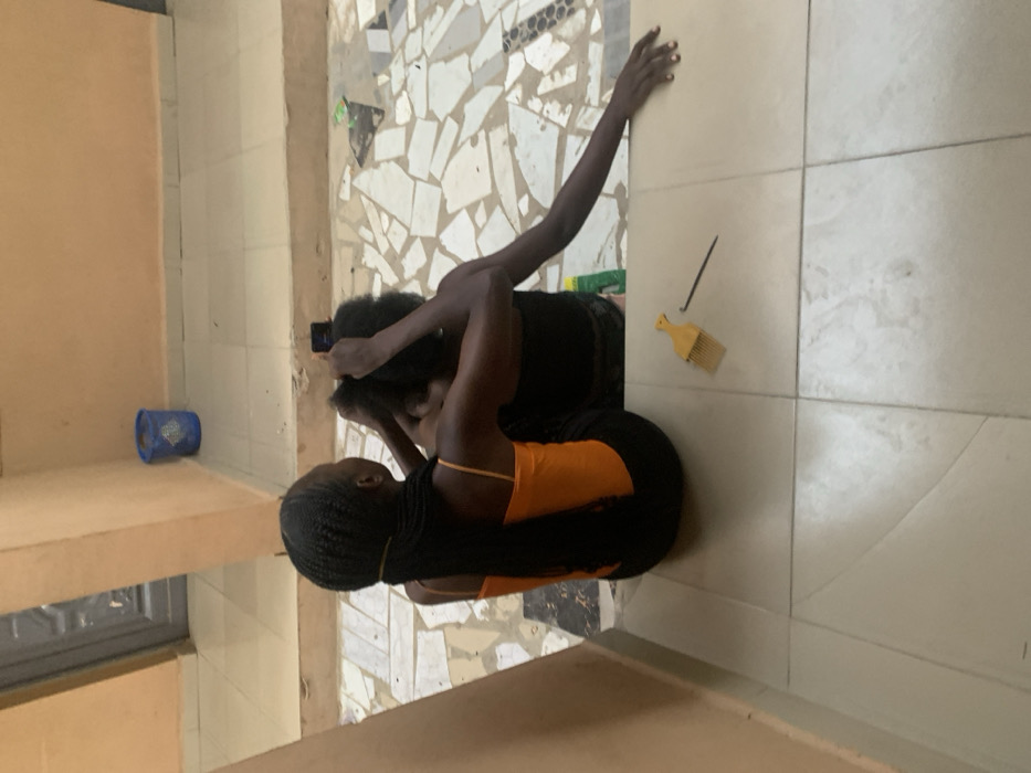 The image displays two individuals engaged in hair styling in an outdoor setting within Dabawa, Nigeria. One individual, positioned on a light-colored tiled ledge, wears an orange spaghetti-strap top and black bottoms; her hair is styled in dark braids forming a ponytail. This individual is actively manipulating the hair of a second person, who is seated on a lower, multi-patterned tiled surface. The second individual has dark, natural curly hair and wears a black strapless top. A dark-colored smartphone is upright near the top of the second individual's head. On the tiled ledge in the foreground, to the right of the first individual, a yellow wide-tooth comb and a black braiding tool are present. The background features a light brown wall, a closed dark grey door, a blue plastic bucket, and a green bottle situated on the lower tiled ground. The ground surface consists of two distinct tile patterns: larger, lighter-colored square tiles on the ledge and smaller, irregularly shaped, lighter-colored tiles on the lower ground.