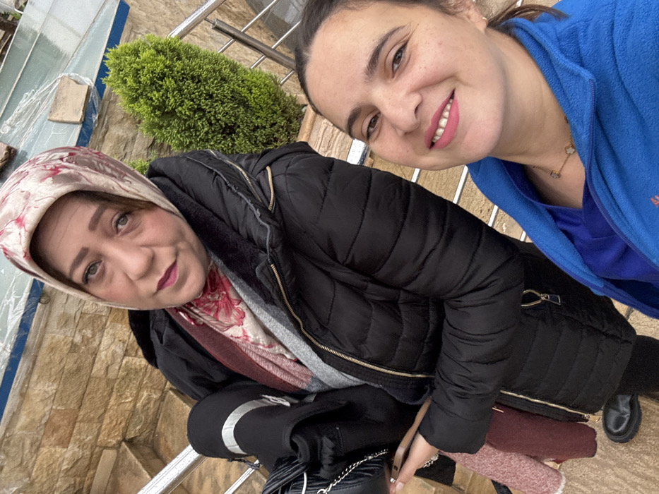 Two adult females are captured in a close-up outdoor photograph in Meknes, Morocco. The subject on the left, an older female, wears a beige headscarf with pink floral patterns, a black puffer jacket with a visible fur lining, a multi-colored scarf (red, grey, cream), and black shoes. She holds a black quilted purse with a chain strap in her left hand and looks toward the camera with a neutral expression. The subject on the right, a younger female, wears a blue fleece jacket over a darker blue top, a light-colored necklace, and has her dark hair pulled back; she smiles directly at the camera. Both individuals are positioned on a light-colored stone or tiled surface, likely stairs or a raised platform, with a metallic railing visible on the left. The background features a small, green bushy plant and reflective surfaces, possibly glass or water, along with additional stone structures.