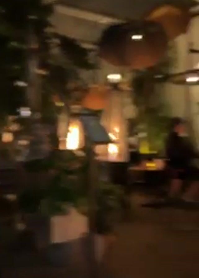 The video begins with a close-up of a young man wearing a tan baseball cap, a light-colored shirt, and a black leather jacket. He is looking directly at the camera. The camera then pans to the right, revealing an outdoor setting at night. There is a fire pit with flames in the center of the frame. As the camera continues to pan, it shows a table with chairs, decorative plants, and lanterns with colored lights hanging in the trees. The environment appears to be a restaurant or outdoor dining area.