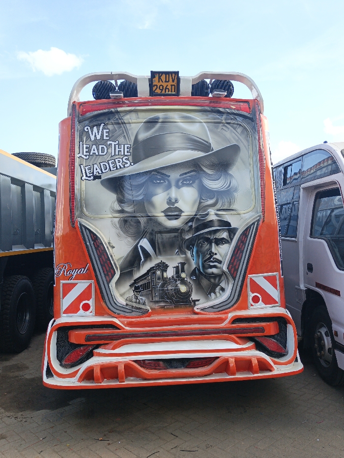 The image presents the rear view of an orange and white customized public transport vehicle, identified as a Kenyan matatu by its design and license plate "KDV 296D," located in an outdoor parking or service area within Nairobi, Kenya