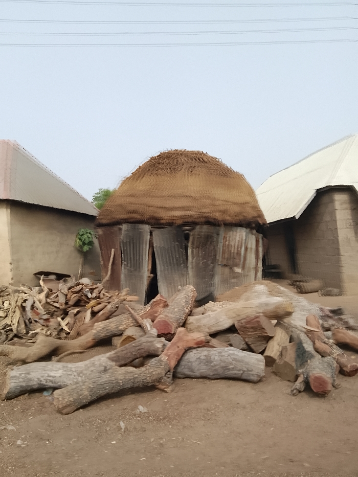 The image displays an outdoor scene in Shendam, Nigeria. In the foreground, a substantial pile of cut logs and firewood pieces of various sizes and shades rests on dry, light brown soil. Some logs exhibit reddish internal wood. Centrally located in the midground is a circular hut with a distinct conical thatched roof. Its walls are composed of vertical corrugated metal sheets, some displaying rust, with an irregular opening functioning as an entrance. To the left of the hut, a rectangular structure with light brown walls and a gently sloping, light-colored corrugated metal roof is visible. A small green plant stands near this building's wall, adjacent to a smaller cluster of firewood. To the right, a partial view of another rectangular building with light grey walls and a steeply pitched white corrugated metal roof is present. The background features a pale blue, cloudless sky, with three parallel overhead wires traversing horizontally across the upper portion of the frame. No individuals, animals, or active subjects are visible.