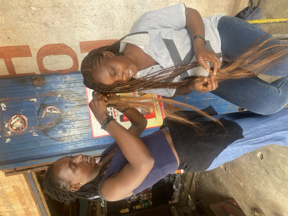 Two women are braiding hair. One woman with braided hair lies on her back while the other woman, seated, braids. The seated woman has dreadlocks and is wearing a dark blue top. The first woman wears a grey t-shirt and blue jeans. They sit near a building with faded writing on the wall and merchandise displayed in the background. There is a blue door or bench near them with stickers. A sign in the lower left includes contact information.