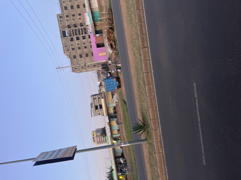 This image depicts a wide shot of an urban landscape within Biashara ward, Kenya, likely during early morning or late afternoon, characterized by a light blue sky. The foreground features a dark asphalt road with a single white dashed lane marking, bordered by a short concrete curb separating it from a narrow strip of dry grass. A small agave plant is centrally positioned on this grassy strip. To the left, a tall grey pole with a double-sided rectangular sign prominently displays "BOOK THESE SPACES" and a phone number (0725 654 380) in black text on a white background with an orange stripe. In the midground, beyond the grassy strip, a dirt and grass shoulder runs parallel to the road. A blue utility truck, possibly laden, is parked or stopped facing right. Two adult males are visible to the right of the truck, both wearing light-colored clothing and carrying light-colored bags. Further right, a large pile of cut wooden logs rests on the ground next to a single-story, pink-painted structure with a brown entrance. Adjacent to the pink building, another single-story structure, painted light green, is visible. Along the same line of sight to the left, a series of connected single-story commercial stalls or shops with light yellow and green facades are present. Several indistinct figures are visible near these shops, and one individual is seen walking across the grassy area in front of them. In the background, behind these smaller structures, multiple multi-story buildings are prominent. A large, unfinished or derelict grey concrete building with numerous dark, rectangular window openings dominates the right side. To the left of this, another multi-story building, also appearing partially constructed, features similar concrete architecture. Further to the left and in the distance, a taller, more modern-looking building with yellow accents is visible. Overhead power lines traverse the scene from the right, supported by utility poles.