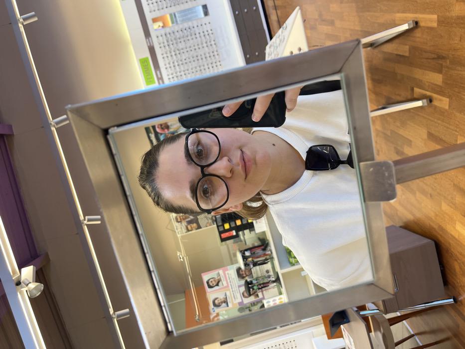 The image depicts a young adult female reflected in a silver-framed standing mirror, situated within an optician's store in Vendenheim, France