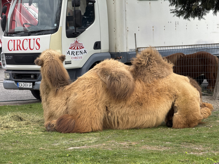 A two-humped Bactrian camel with shaggy, light-brown fur is resting on green grass in the foreground. The camel faces left, with its head slightly rotated towards the viewer, and its limbs are tucked beneath its body. A small quantity of hay lies on the grass to the camel's left. Behind the camel, a white DAF truck is parked, displaying "CIRCUS" in red lettering on its left front and "ARENA CIRCUS" with a red tent logo on its right front. The truck's license plate is "CA 2434 TP." Further in the background, a metal fence is visible, behind which a dark brown animal is partially obscured. A tree with dark green foliage is present in the upper right background. The scene is an outdoor setting on a grassy area in the city of Sliven, Bulgaria.