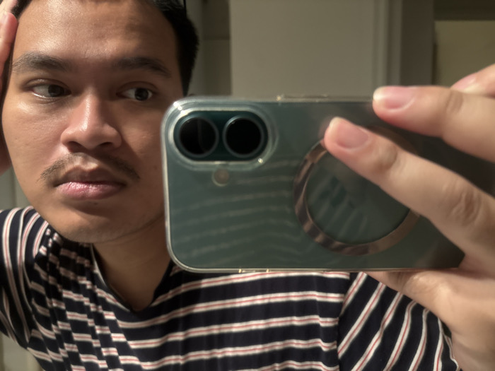 This image depicts a male individual taking a mirror selfie in an indoor environment. The specific location within Paris, France, cannot be determined from the visual information provided. **Subject:** A male individual, appearing to be of East Asian descent, is captured from the chest up, reflected in what appears to be a mirror. He has short, dark hair, a light mustache, and is wearing a dark-colored t-shirt with thin, light-colored horizontal stripes. His gaze is directed towards his left, away from the phone's camera, creating a slightly pensive or distant expression. His right hand is raised, with fingers touching the side of his head/forehead, and his left hand holds the smartphone horizontally. **Objects:** The primary object is a smartphone, likely an iPhone model with a dual-lens camera system, held by the individual's left hand. The phone is encased in a clear protective cover, revealing a dark green or teal phone body. A prominent circular, metallic MagSafe ring is affixed to the exterior of the clear case. The phone's rear camera module, featuring two large lenses, is distinctly visible. **Actions:** The individual is engaged in the act of taking a self-portrait (selfie) using the reflection in a mirror. His posture and gaze suggest a casual or introspective moment rather than a direct pose for the camera. **Environment:** The background behind the individual's reflection is indistinct, appearing as a light-colored, possibly off-white or beige, wall or surface. This suggests an indoor setting, potentially a bathroom, bedroom, or private room, illuminated by artificial light.