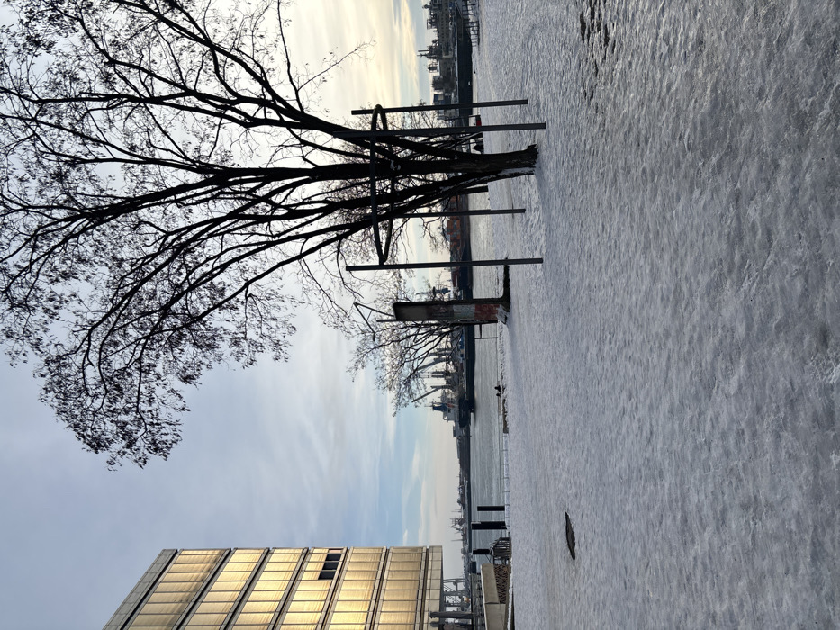 The image depicts a snow-covered waterfront promenade in HafenCity, Hamburg, Germany, during daylight hours under an overcast sky with patches of blue. In the foreground and midground, the ground is covered in a patchy layer of snow and ice, exhibiting an irregular texture. To the left, a multi-story modern building dominates the frame, featuring a gold-toned, horizontally segmented facade that reflects direct sunlight. One window on the third floor from the bottom appears open. Adjacent to this building and extending along the water's edge, a dark-colored concrete or stone wall is visible, with several dark, vertical bollards or posts protruding from the water near it. In the center and extending to the right, several bare, deciduous trees stand on the snowy ground. The largest tree, centrally positioned, is surrounded by a metallic structure consisting of four dark vertical poles arranged in a square or rectangular formation, with one horizontal bar connecting two of them, forming a partial frame. Another smaller tree is visible further back and to the left of the main tree. Beyond the promenade, a wide body of water, likely a section of the Elbe River or a port basin, extends into the distance. On the far bank, numerous industrial port elements are visible: several large cargo ships are docked, accompanied by numerous tall gantry cranes and other industrial structures and buildings. The sky above is a light blue with streaks of white clouds. Two indistinct figures are observable sitting or resting on the snowy bank across the water, near the water's edge, slightly right of center. Another distant figure is seated further to the right, near the water, beneath the large tree. The overall scene suggests a cold, winter day in an urban port environment.
