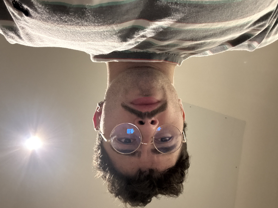 An upside-down close-up depicts a man with glasses, a mustache, and curly dark hair. He's wearing a striped shirt. The background is plain, with a bright light source causing a glare on the left side. His face is centered in the frame, with his shirt visible at the top and the background filling the remaining space.