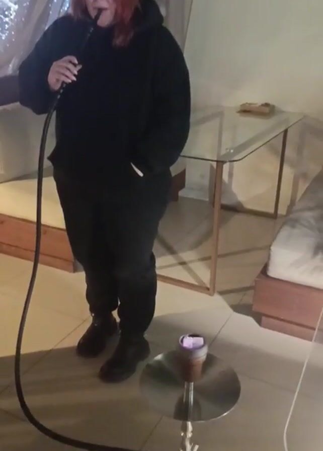 A person, likely a young woman, is standing and smoking from a hookah indoors