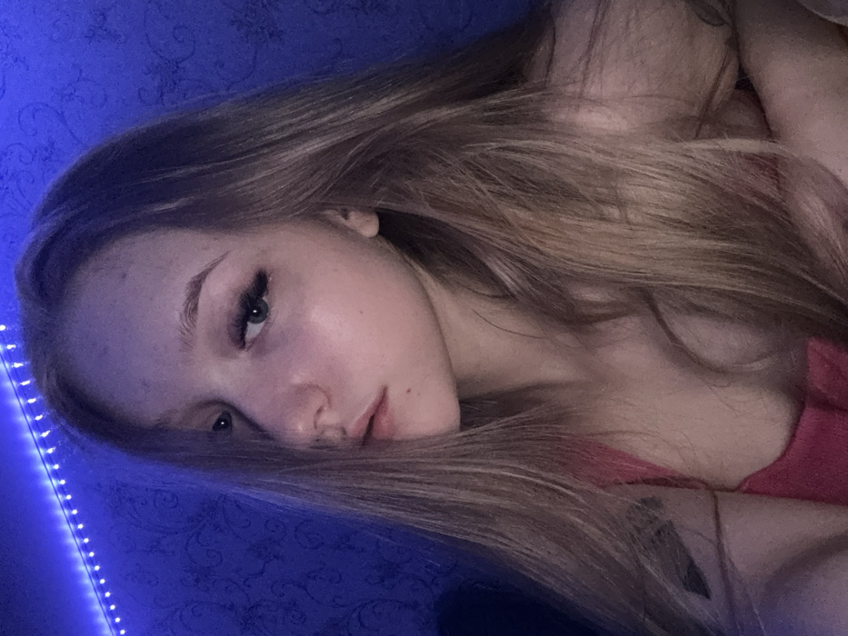 A blonde woman with heavy eyelashes reclines. She wears a pink top, and a tattoo is visible on her arm. The image is dominated by cool blue lighting illuminating the wall behind her, accentuated by a string of LED lights. Her hair is draped across the blue surface, creating a soft contrast. She looks at the camera, her expression suggesting a calm or contemplative mood.
