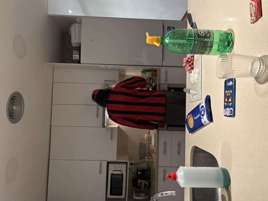 A kitchen scene shows a person in a striped shirt preparing food. On the countertop are chopped onions, sausages, a knife, spaghetti, a drinking glass, a cleaning product bottle, and a spray bottle, along with other objects. A white refrigerator and white cabinets are visible in the background. The person is standing in front of the cabinets, seemingly cooking.