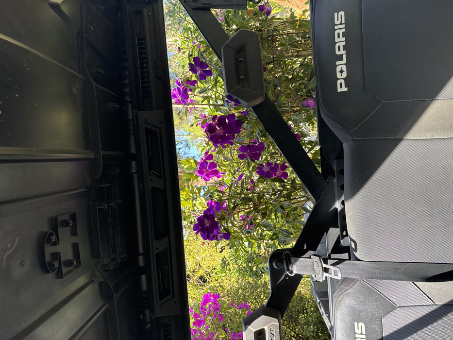 An interior view from inside a Polaris vehicle reveals purple flowers and green foliage outside the open space
