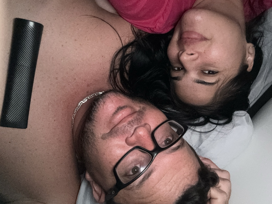 The image displays two individuals, one male and one female, lying down in an indoor setting, consistent with a bedroom