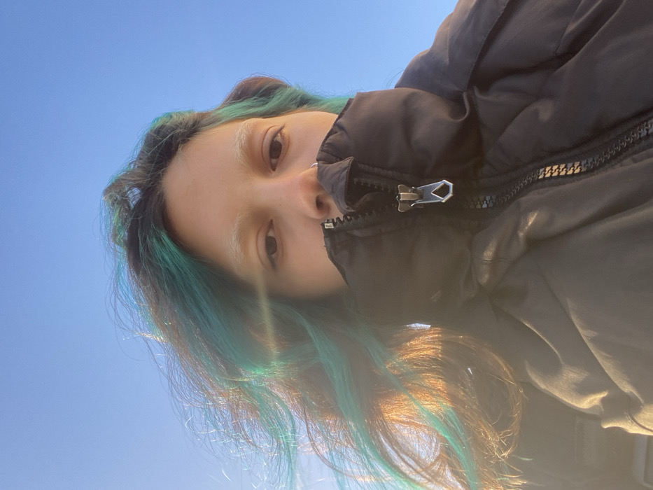 - "A close-up, low-angle portrait features a person with dark hair prominently streaked with teal/turquoise and bleached eyebrows" by FM-whkRu1, licensed under CC BY 4.0