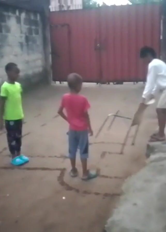 The scene unfolds in an outdoor space with a walled perimeter and a closed, red-colored gate. The ground is covered with light-colored dirt. In the center of the frame, two young boys stand on the dirt. The boy on the left is wearing a green shirt with patterned pants and blue footwear. The boy on the right is clad in a red shirt and blue shorts, without footwear. A third person, presumably an adult female due to the white dress, stands to the right of the boys. She is in the process of lifting a four-legged, metal frame. Next to her, a large, blue plastic tub sits on a concrete slab, containing some objects inside. The focal point on the dirt is a crudely drawn outline resembling a human figure with a head, torso, legs, and arms. This outline appears to be drawn with small rocks or pebbles. The boy on the left stands within one of the foot sections of the figure, while the boy in red stands just to the left of the figure's torso. The woman appears to be repositioning the metal frame closer to the tub, seemingly preparing to move items or engage in a specific activity.
