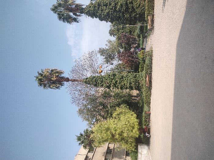 The image displays an outdoor public space in Ash-Shaghour Municipality, Syria, under a clear light blue sky with sparse white clouds. The foreground consists of a broad, flat expanse of light tan, unpaved ground, possibly gravel or compacted earth, exhibiting subtle textural patterns. A large, dark shadow extends into the lower left quadrant of this area. Beyond the foreground, the midground opens into a landscaped garden featuring diverse mature trees and shrubs. Two tall palm trees with green fronds are prominent, one positioned centrally and another to the right. Beneath these, several conical evergreen trees are visible, along with deciduous trees, some with light green foliage and others with bare or sparse branches. Manicured green hedges and various shrubs define the garden's boundaries and a central pathway. Three wooden park benches are present within the garden: one on the left, partially shaded by a light green tree; one in the center-right; and another further right, partially obscured by vegetation. A street lamp with a yellow fixture is visible centrally among the trees. Near the leftmost bench, a small red cylindrical object is on the ground. A light-colored, patterned pedestrian path, possibly cobblestone, originates from the center of the garden and recedes into the background. On the far left, a multi-story building with several windows and a light-colored facade is partially visible in the background. Two individuals are observed. One person is seated on the leftmost wooden bench, facing right, wearing dark clothing. A second person is walking from left to right on the garden path in the mid-background, wearing a dark garment and a light-colored head covering. No direct interaction between the individuals is discernible. The scene is illuminated by bright sunlight, casting distinct shadows.