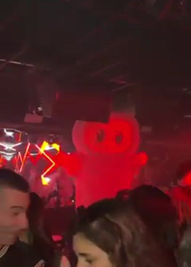 lively nightclub scene bathed in red lighting, featuring a large, animated mascot with a smiling face moving among a crowd of people. The mascot is white with red eyes, resembling a cartoon character. People are visible in the foreground and background, their faces intermittently illuminated by the lighting. The club's interior includes lighting fixtures, speakers, and other structural elements. The crowd seems engaged, possibly dancing, as the music plays in the background.