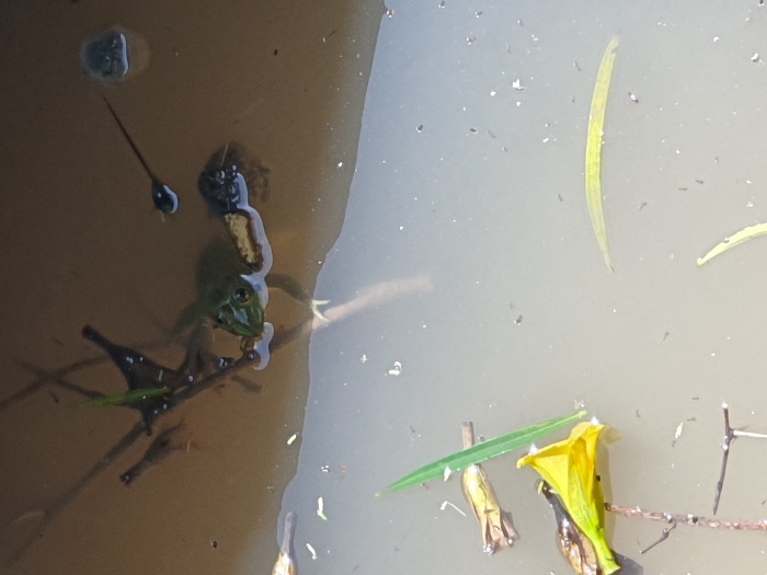 The image depicts a shallow, murky body of water located in Kobura ward, Kenya. A single green frog is positioned in the upper-center, with its head and upper back visible above the water surface; its eyes are open. To the upper right of the frog, a dark-bodied tadpole with an elongated tail is observed. The water contains various organic debris, including several thin, dark plant stems near the frog, a distinct green leaf blade in the lower-left quadrant, and a fallen yellow, bell-shaped flower floating in the lower-left. Numerous smaller particulate specks are distributed throughout the water column and on the surface. No human subjects or their interactions are present.