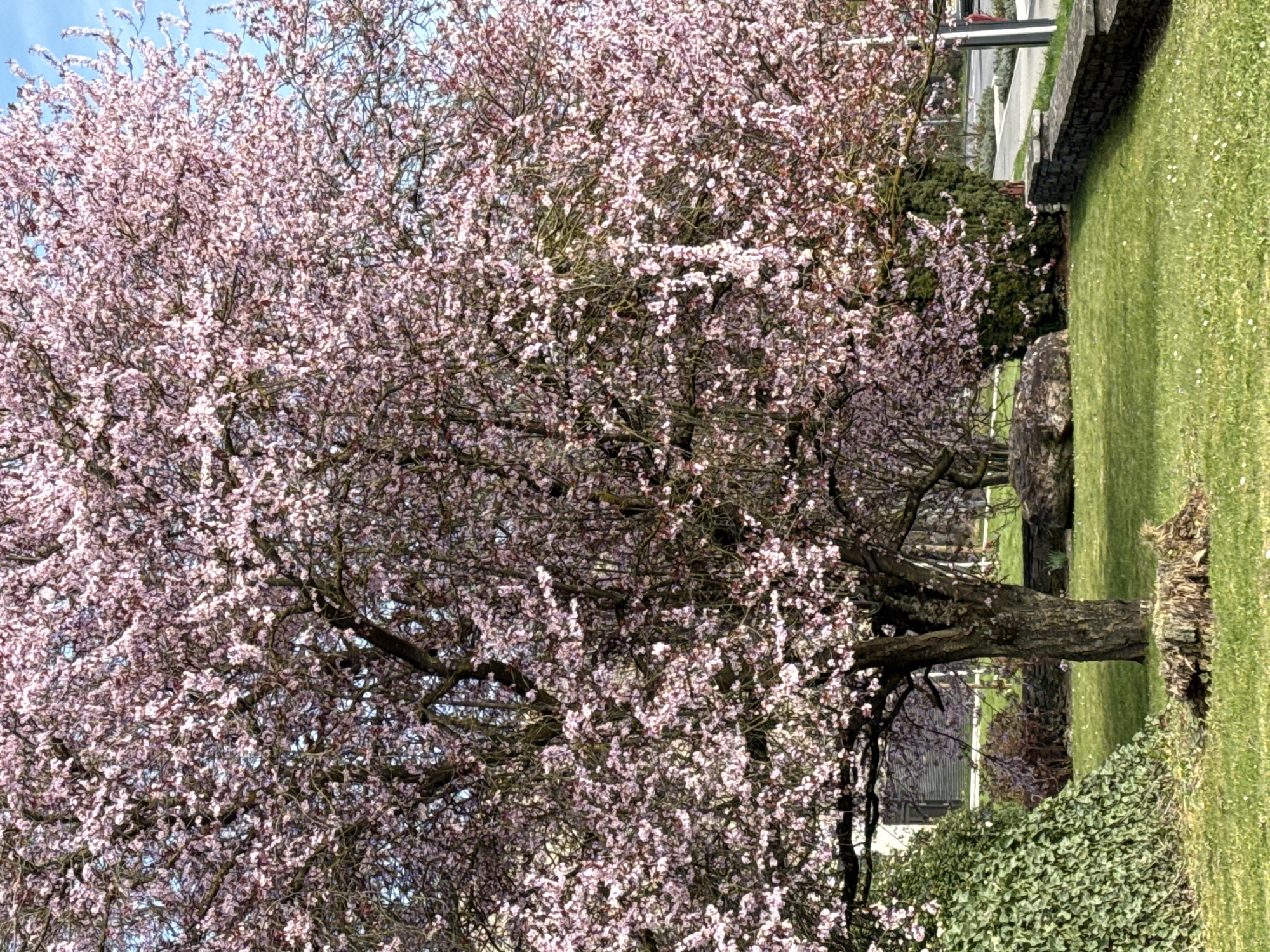 The image displays a landscaped outdoor area in Grevenmacher, Luxembourg, under a clear blue sky. Several large flowering trees, covered in light pink blossoms, dominate the scene. The prominent tree in the foreground features a dark, textured trunk and extensive branching. A manicured green lawn, dotted with small white flowers, covers the foreground and midground. Two dark boulders rest on the grass. To the left, a dense green hedge borders the lawn. On the right, a low, dark grey stone wall separates the lawn from a paved surface, likely a road or sidewalk, visible in the background. Curb-side plantings and a vertical dark pole are visible alongside the paving. A building with dark features is partially visible through the trees in the distant background on the left. No individuals or active subjects are present.