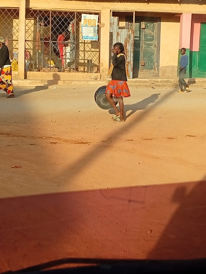 A young girl in a red skirt and black jacket stands next to a rolling tire on a dirt road. A woman in a patterned skirt walks by on the left. A man walks in the distance on the right. Buildings form a backdrop with barred windows and painted doors. The light casts long shadows, suggesting it's either morning or evening. The lower portion of the frame shows what appears to be a vehicle dashboard.