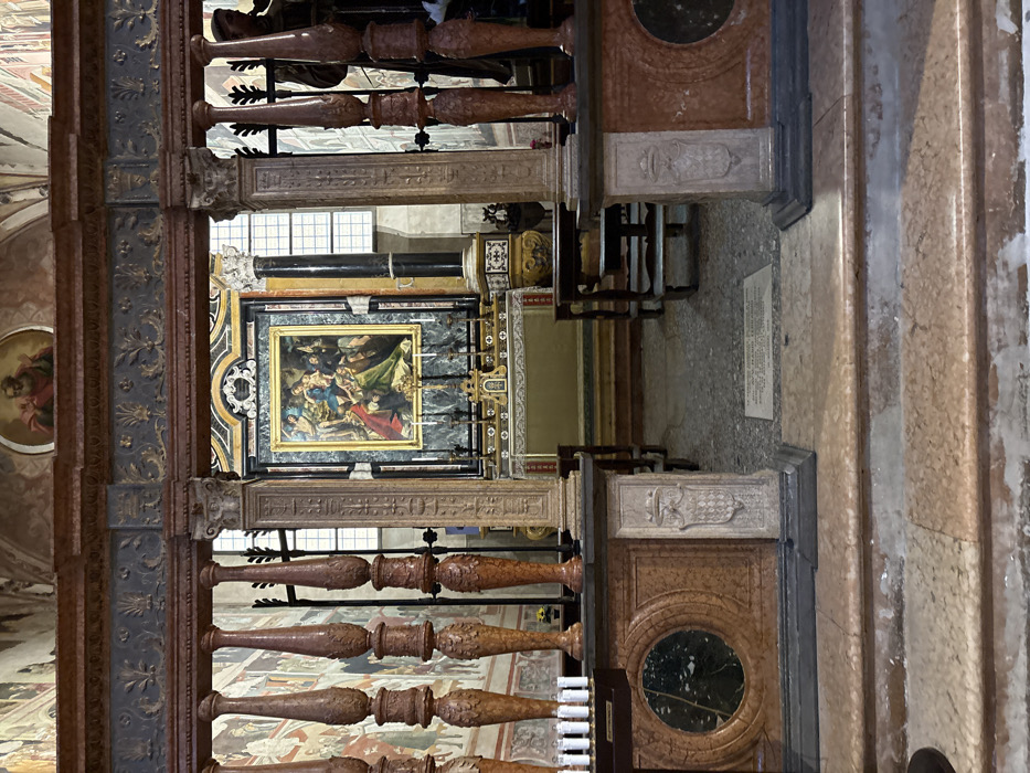 This image captures the interior of a historical religious structure, specifically within the Church of San Francesco del Prato in Parma, Italy, looking into a chapel that houses an altarpiece depicting a Lamentation or Deposition of Christ. The scene is viewed through an elaborate, ornate balustrade or choir screen that frames the lower and mid-ground. This barrier consists of reddish-brown marble plinths, intricately carved balusters, and supporting columns made of lighter, relief-carved stone, topped by a dark frieze with gilded decorative motifs. On the left side of the balustrade, a wooden tray holds multiple white, unlit votive candles. The floor in the immediate foreground consists of worn, reddish-brown and beige marble steps leading up to the area beyond the screen. Through a central opening in the balustrade, an altar with a large altarpiece painting is visible. The painting, set within a dark marble frame with an ornate crest, depicts a religious narrative featuring multiple figures in a dynamic composition, employing prominent reds, greens, and browns. Below the painting, a simple altar table holds two tall white candles and a central golden reliquary or tabernacle. Behind the altar, a large rectangular window with a grid pattern allows natural light into the space. To the immediate right of the altar, a tall, dark marble column with a white capital stands. The walls beyond the balustrade are adorned with extensive frescoes or painted murals depicting narrative scenes with numerous human figures in muted, earthy tones. On the right, a dark, sculpted figure, possibly a monk or saint, is partially visible. Two simple wooden benches are positioned on the floor to the right, facing the altar. The floor beyond the screen is composed of gray, speckled stone or terrazzo, with a rectangular light-colored stone plaque or tombstone embedded centrally in the aisle directly in front of the altar. Overhead, sections of the vaulted ceiling feature painted decorations, including a circular medallion depicting a single figure. No living individuals are present in the frame.