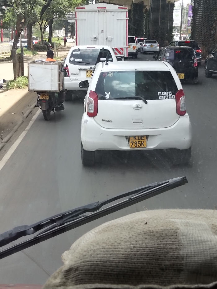 The image depicts an urban traffic scene in Nairobi, Kenya, likely along a thoroughfare near the Nairobi Expressway, viewed from the interior of a vehicle through its windshield