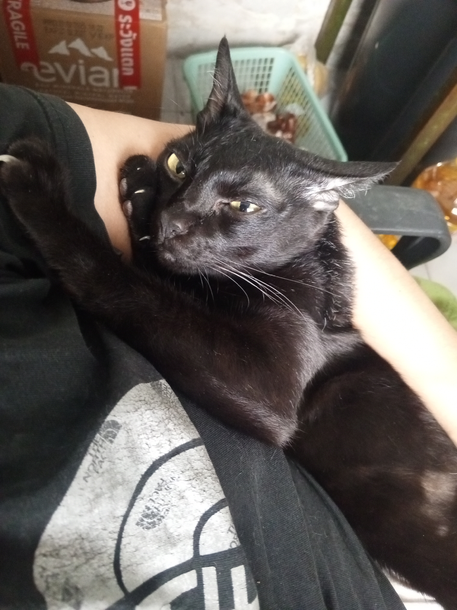 - "A person in a dark-colored t-shirt is holding a black cat in their arms" by FM-4jmv92, licensed under CC BY 4.0