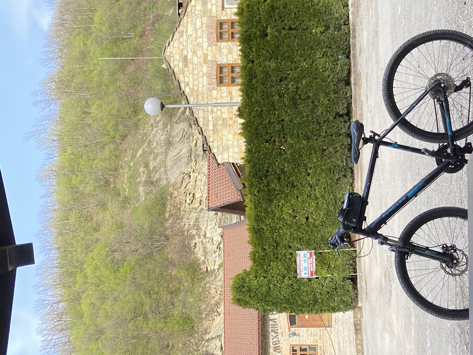 bicycle parked on a paved surface in the vicinity of buildings in Pchelishte, Bulgaria. The bicycle is a black and blue mountain bike, positioned vertically in the frame. A building with a stone facade, windows with brown frames, and a red tiled roof is visible in the background. There is also a green hedge or bush between the bike and the building. A sign with text in Bulgarian can be seen near the hedge. A wooded hillside is present on the left side of the frame, with trees showing the early stages of spring foliage. A streetlight is positioned near the building and hillside.