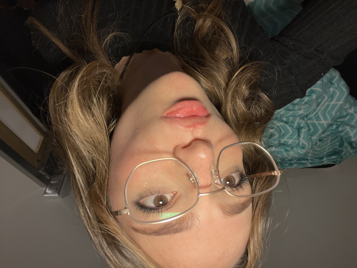 - "An upside-down view of a woman with blonde wavy hair, wearing glasses, dark clothing, and a brown top underneath" by FM-Co7az1, licensed under CC BY 4.0