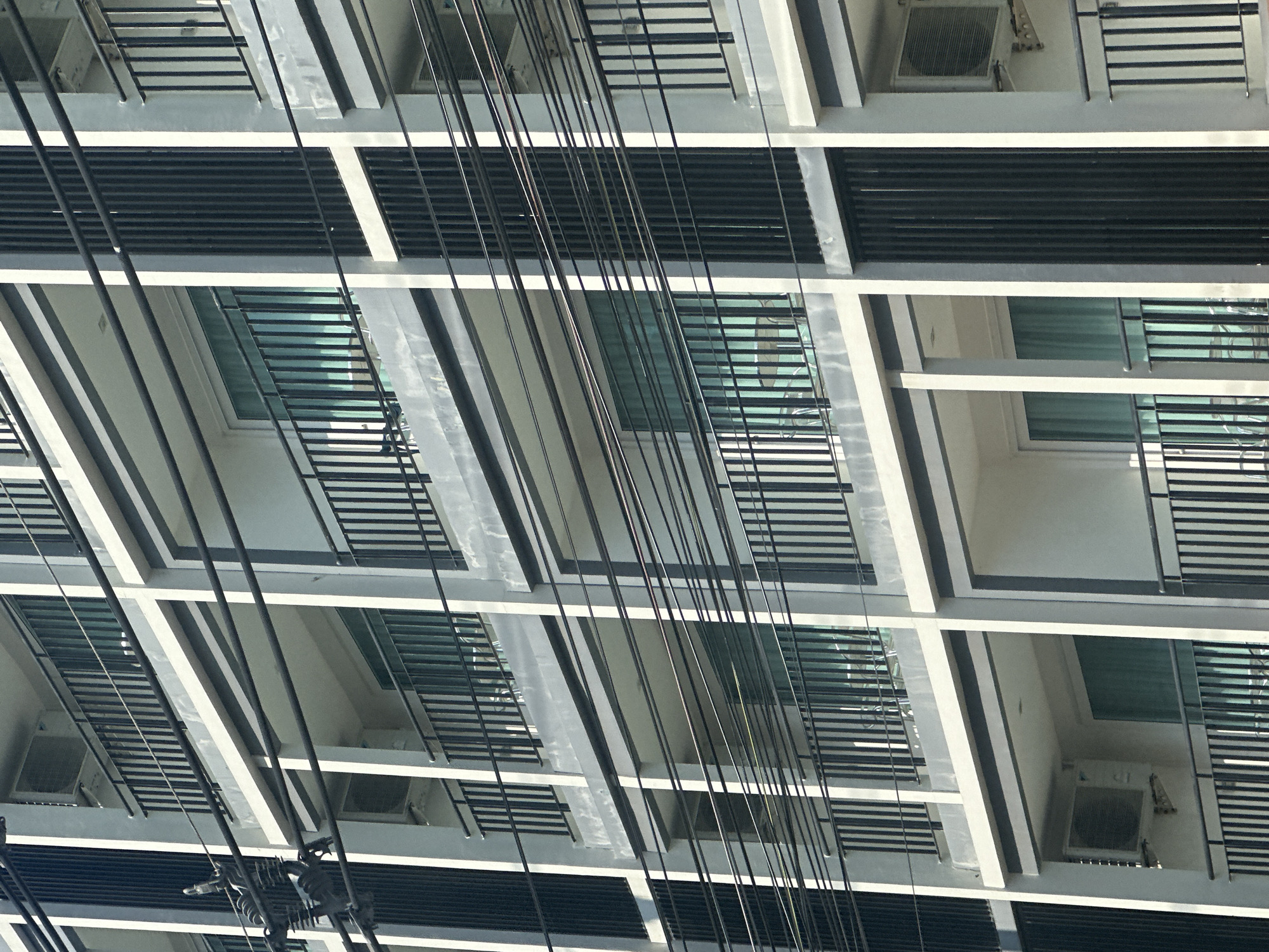 An upward-angled shot reveals the facade of a building, likely an apartment complex, overlaid with a network of dark, electrical cables. The building's architectural features consist of white rectangular frames housing rows of dark horizontal bars or slats and translucent window panes. A few air conditioning units are affixed beneath the window frames. The city context is Pattaya City, Thailand. The scene includes no people, focusing instead on the architectural elements and the electrical infrastructure.