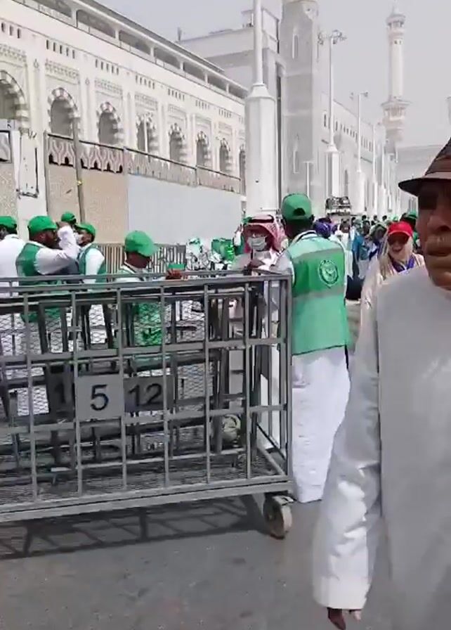 street scene outside a grand building, likely a mosque, based on its architecture with large arches and multiple minarets in the background. Many people of various ages and ethnicities are walking along the street. Several individuals are wearing white robes or traditional clothing associated with Muslim pilgrimage. Some people wear green vests, possibly indicating they are officials or volunteers assisting the pilgrims. Some people are pushing metal carts. The weather appears bright and sunny.