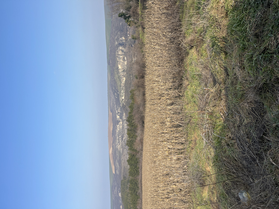 The image displays a panoramic rural landscape near Cherven, Bulgaria. The immediate foreground consists of dry, intermingled grass and weeds, with a discarded clear plastic bottle visible in the lower-left quadrant. A large field of dried, light brown corn stalks occupies the midground, stretching horizontally across the frame. Beyond the field, a band of dormant deciduous trees with bare branches is interspersed with dark green coniferous trees. The background features a deep river canyon characterized by steep, eroded gray and tan rock cliffs. Structures, consistent with a settlement or historical ruins, are discernible on the opposite side of the canyon. In the farthest distance, undulating hills with patches of green vegetation and exposed brown earth extend towards the horizon under a clear, bright blue sky. The scene is static, illuminated by natural daylight; no individuals or active elements are present.