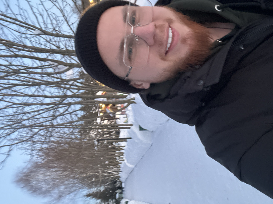 A selfie of a smiling man with a red beard wearing glasses and a black beanie, taken outdoors in a snowy environment