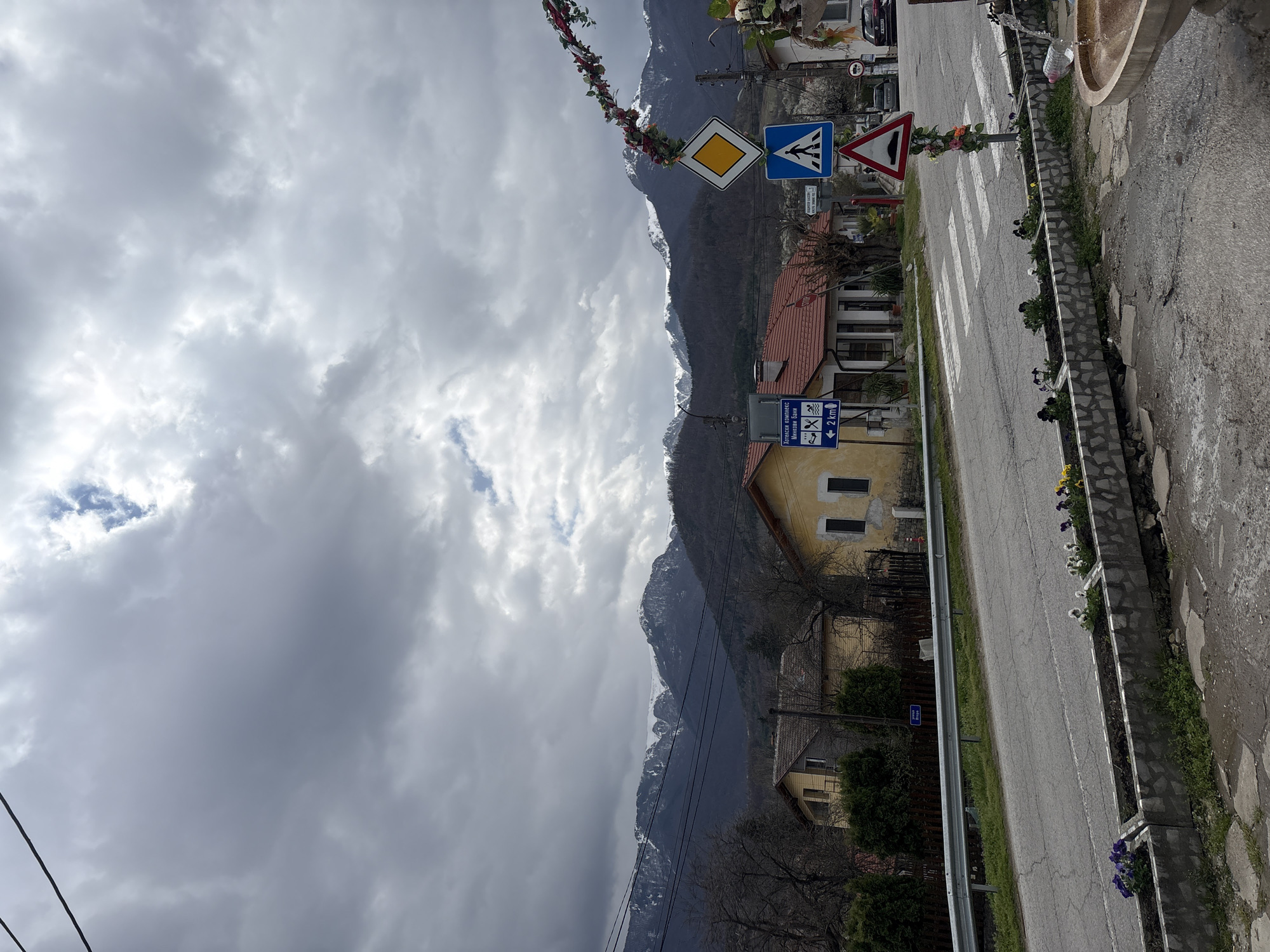 The image depicts a street in Spanchevtsi, Bulgaria, with a mountain range as a backdrop. The sky is overcast with dark, heavy clouds. The street is lined with buildings, including a yellow house and another with a red-tiled roof. Several traffic signs are visible, including a pedestrian crossing sign, a yield sign, and a sign indicating a tourist complex with swimming pool access. The road has a zebra crossing and a crash barrier. The roadside is decorated with flowerbeds containing pansies and daisies. The image is taken in a rural area.